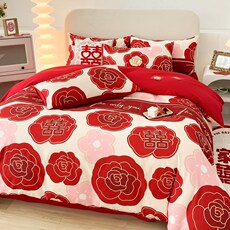高端亲肤棉磨毛四件套数码印花大红被套婚庆喜事床单款床上用品被