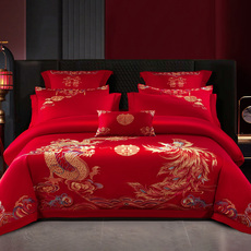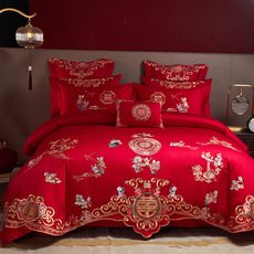新中式轻奢刺绣花结婚庆全棉四件套100S纯棉红陪嫁床上喜被套床单