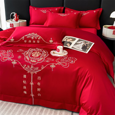 时尚轻奢刺绣花结婚庆全棉四件套100S纯棉红陪嫁娶床上喜被套床单