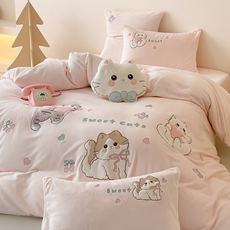 可爱少女卡通全棉水洗棉床上四件套猫咪刺绣被套床单儿童纯棉床品