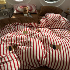 软糯舒适奶咖狗牛奶绒毛巾绣红条纹四件套1.5m1.8法兰绒加厚保暖
