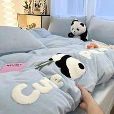 冬季加厚双面牛奶绒床上四件套熊猫刺绣珊瑚绒被套罩保暖绒三件套