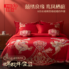 全棉新婚庆四件套大红色长绒棉中式龙凤刺绣结婚纯棉陪嫁床上用品