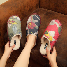 冬季中式印花牛筋底棉拖鞋女居家情侣防滑防臭软底保暖家用棉拖男
