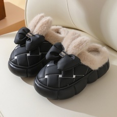 冬季新款PU皮兔毛棉拖鞋女秋冬季高跟皮面家居家鞋室内保暖厚底