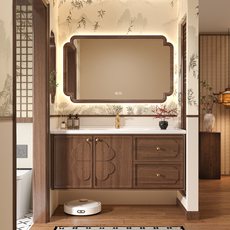 新款中古风胡桃木浴室柜组合卫生间陶瓷一体盆洗手洗脸池洗漱台面