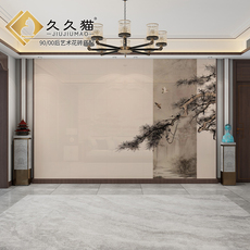 新中式山水画电视背景墙瓷砖客厅岩板大板影视墙装饰实木花格边框