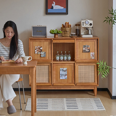 高端实木餐边柜一体靠墙茶水藤编置物柜中古风岩板推拉门储物橱柜