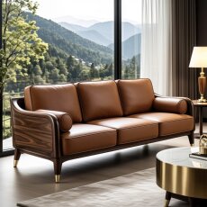 广巢柯茵复古风实木真皮沙发头层牛皮中古客厅直排三人位软包皮艺