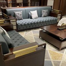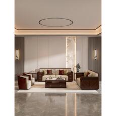 新中式实木轻奢乌金木别墅样板房大小户型皮艺沙发组合大气简约