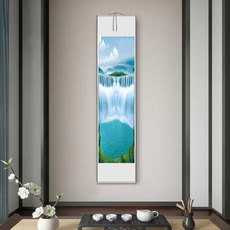 长轴流水瀑布山水画实木卷轴挂画沙发背景墙书房玄关中式风水挂画