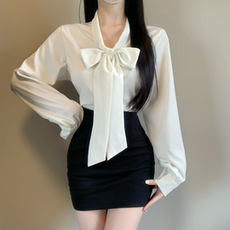 iqcq气球熊法式白色缎面衬衫设计感蝴蝶结上衣高腰修身包臀裙套装
