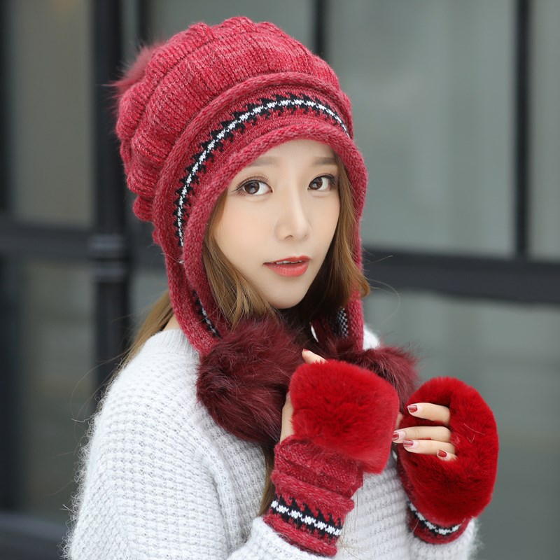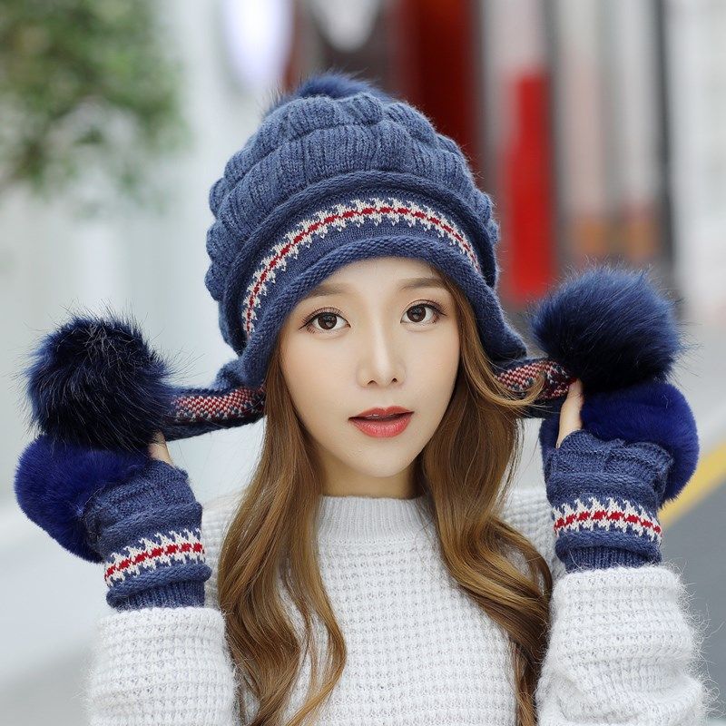 韩国毛线帽子潮女可爱韩版加绒护耳帽骑车手套女冬天厚针织贝雷帽