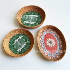 越南藤编贝壳托盘圆形点心果盘家用零食收纳篮馒头筐彩色水果盘
