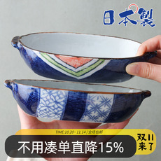日本进口美浓烧陶瓷椭圆盘粗陶手绘沙拉果盘深钵小吃碟双耳甜品盘