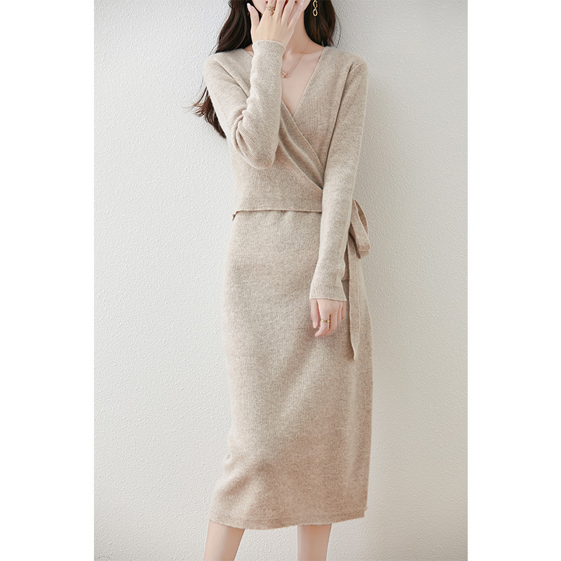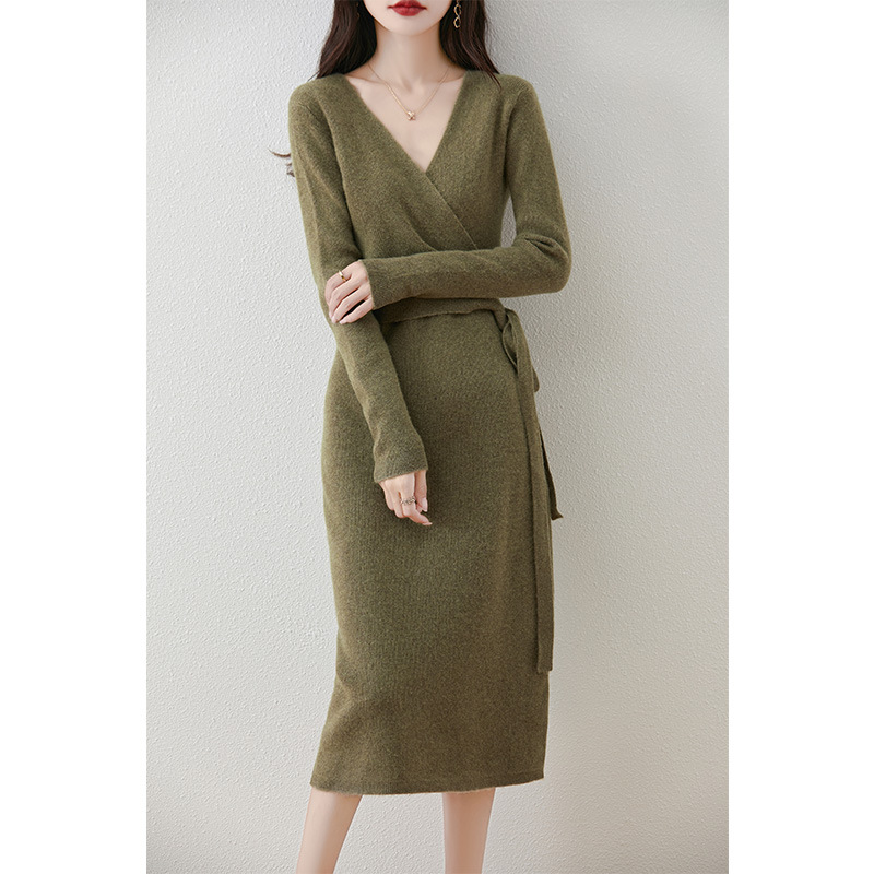 法式交叉领针织纯羊毛连衣裙女秋冬款气质收腰显瘦中长款过膝裙子