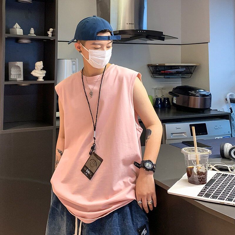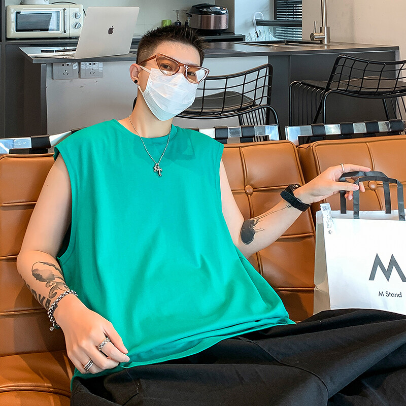 重磅纯棉运动背心男士夏季ins潮牌白色宽松无袖坎肩健身短袖t恤男