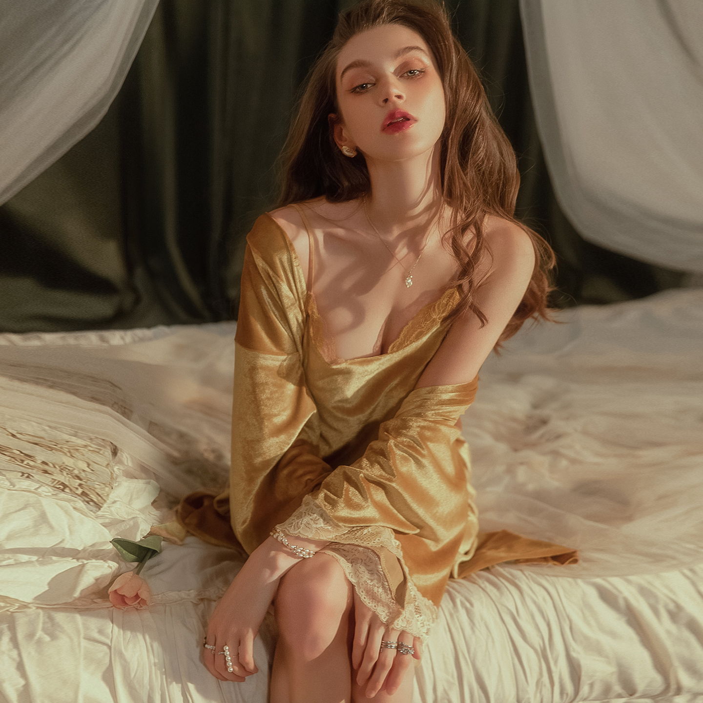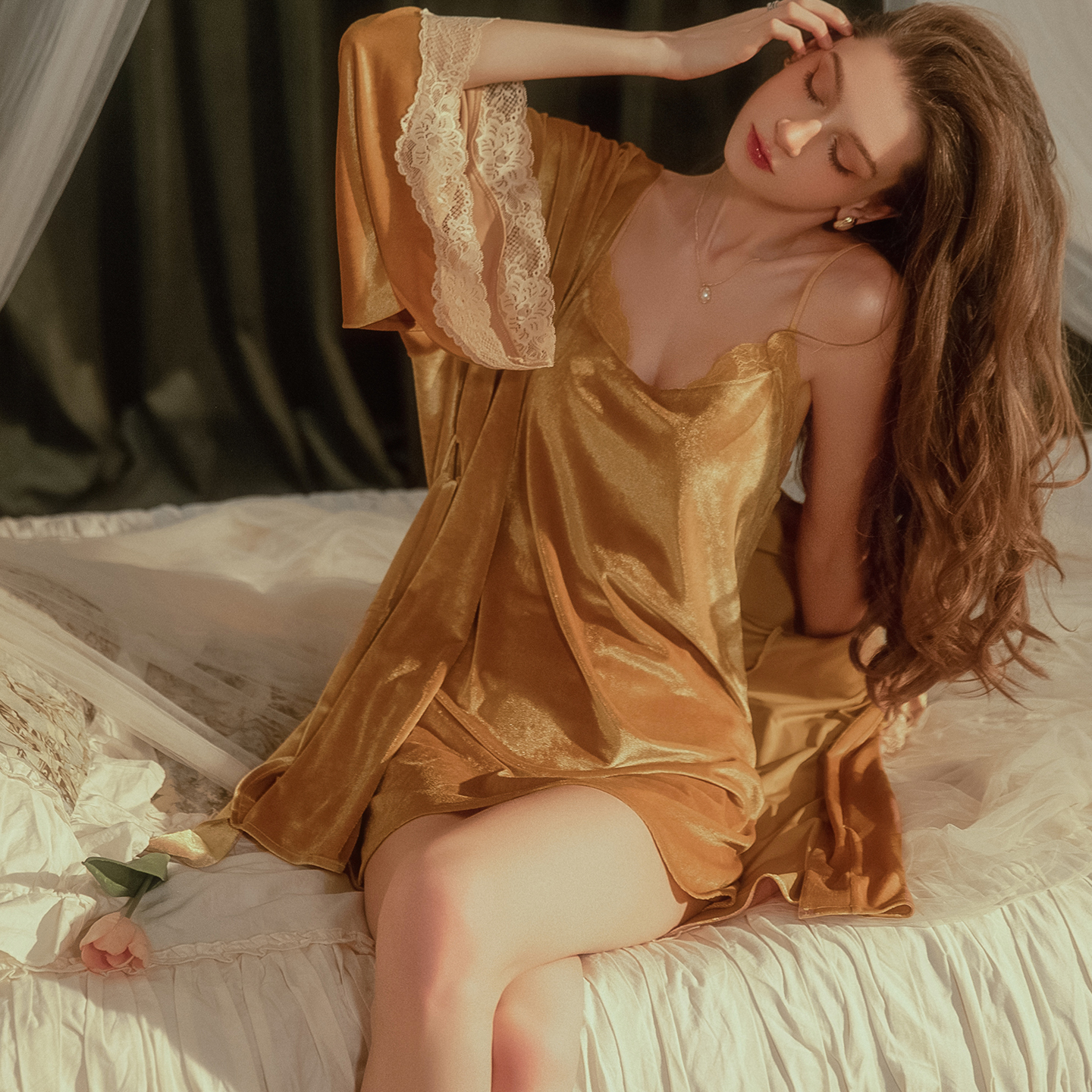 今夕何夕性感睡衣女2025秋季新款纯欲风丝绒小胸吊带睡裙睡袍套装
