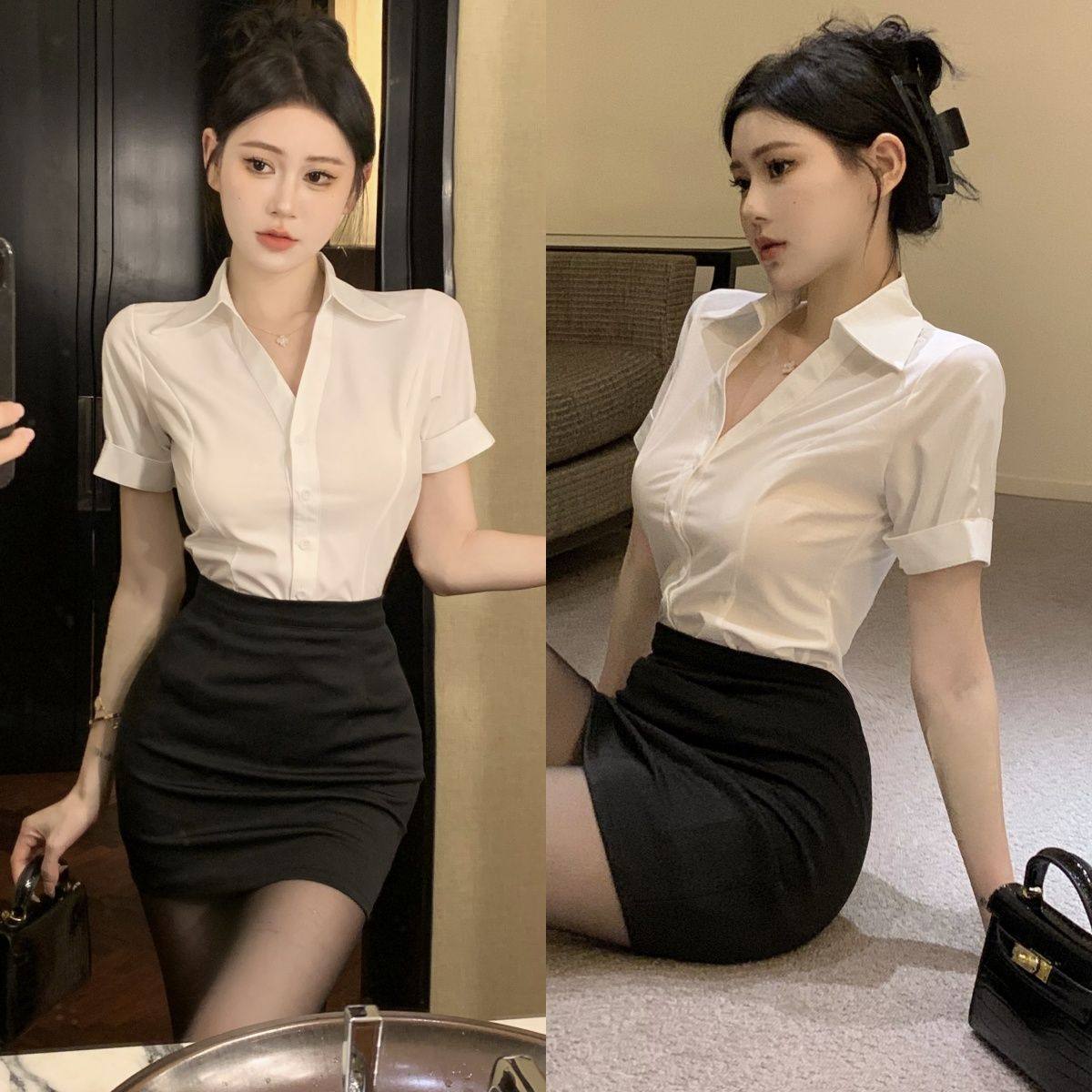 短袖白衬衫女夏季空乘面试工作服V领衬衣空姐前台正装职业女套装