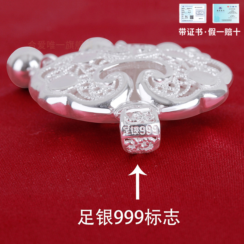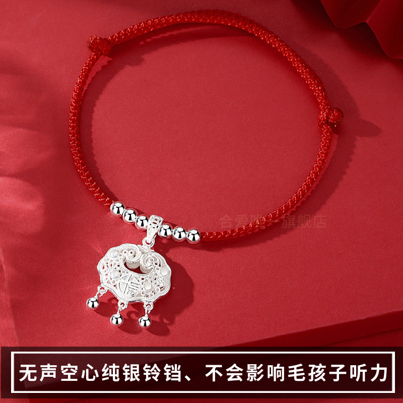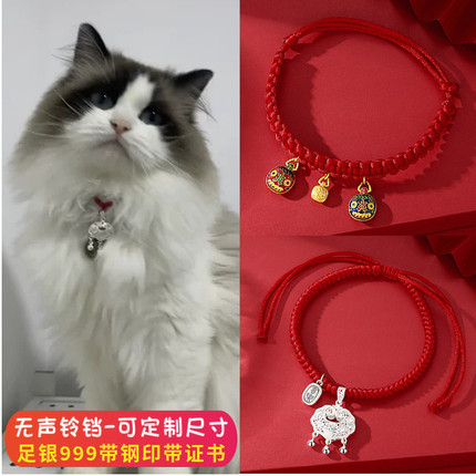 猫咪长命锁纯银足银s999可爱宠物平安锁银锁铃铛项圈狗狗红绳项链