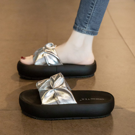 法式银色一字凉拖鞋女夏季外穿2025新款休闲厚底海边孕妇沙滩凉鞋
