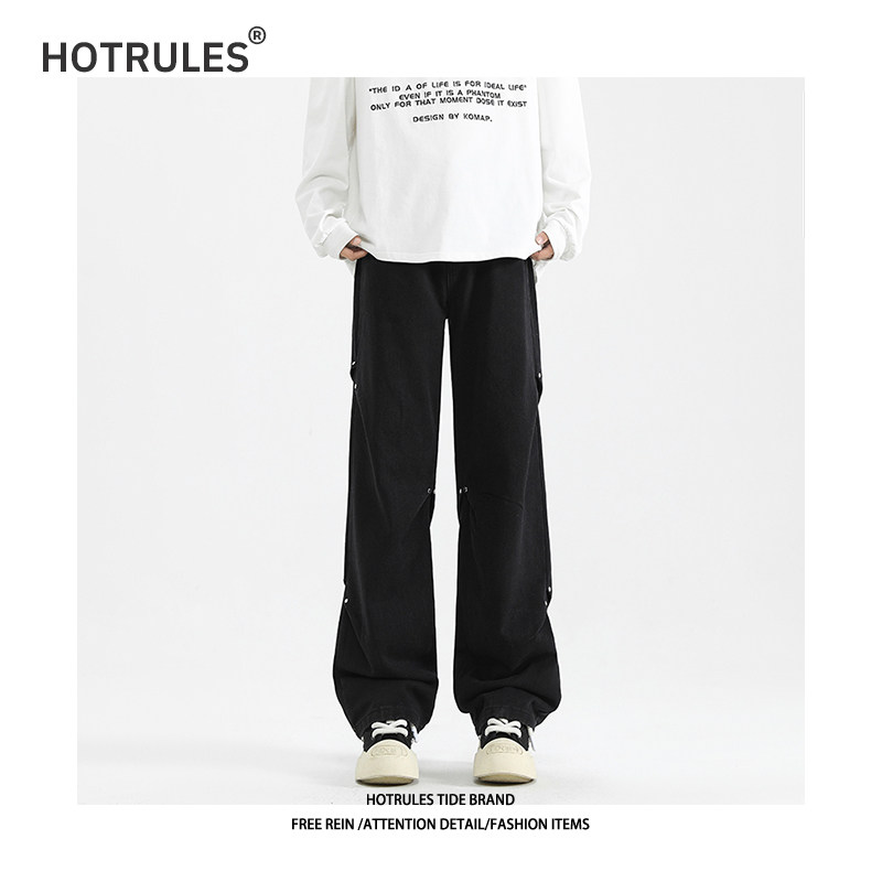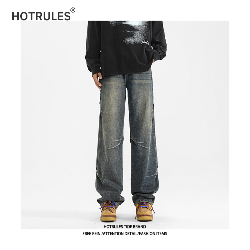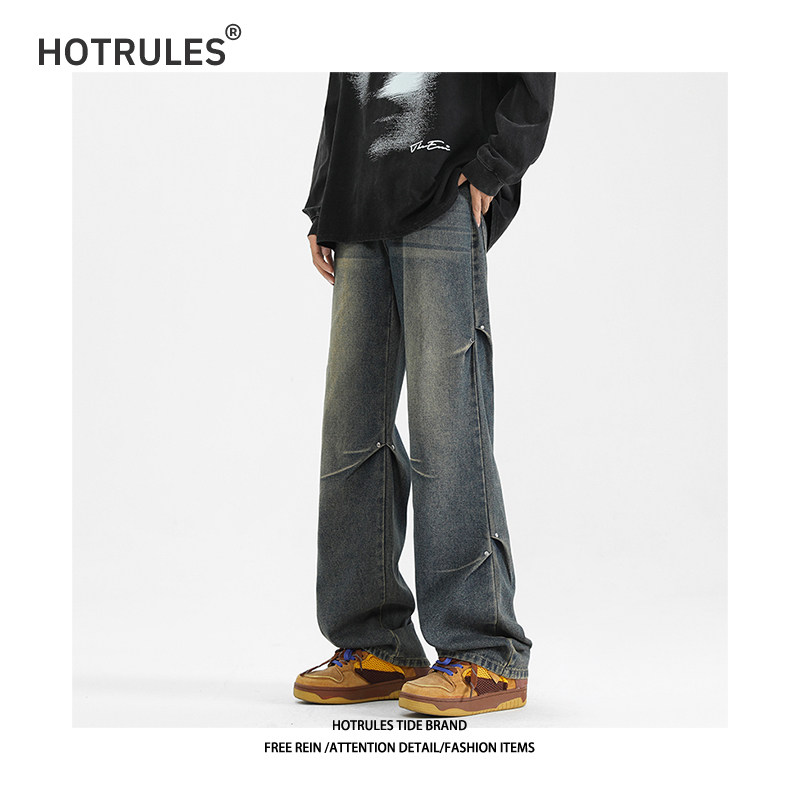 HOTRULES美式潮牌柳钉设计感牛仔裤男士夏季薄款宽松直筒阔腿裤子