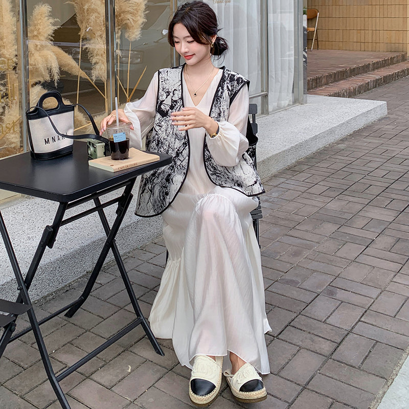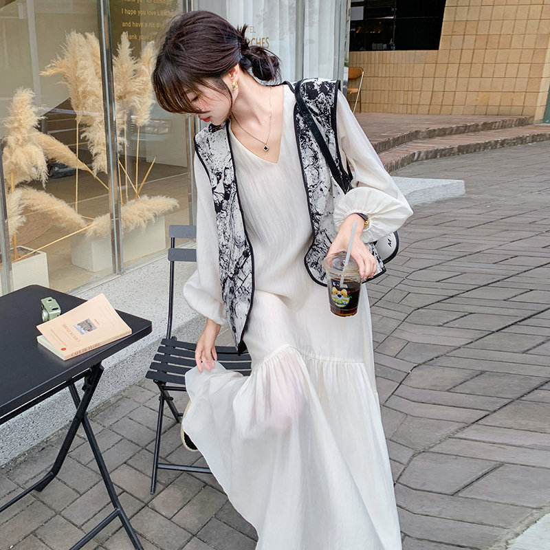新中式国风水墨画马甲连衣裙女秋装搭配一整套气质清冷松弛感穿搭
