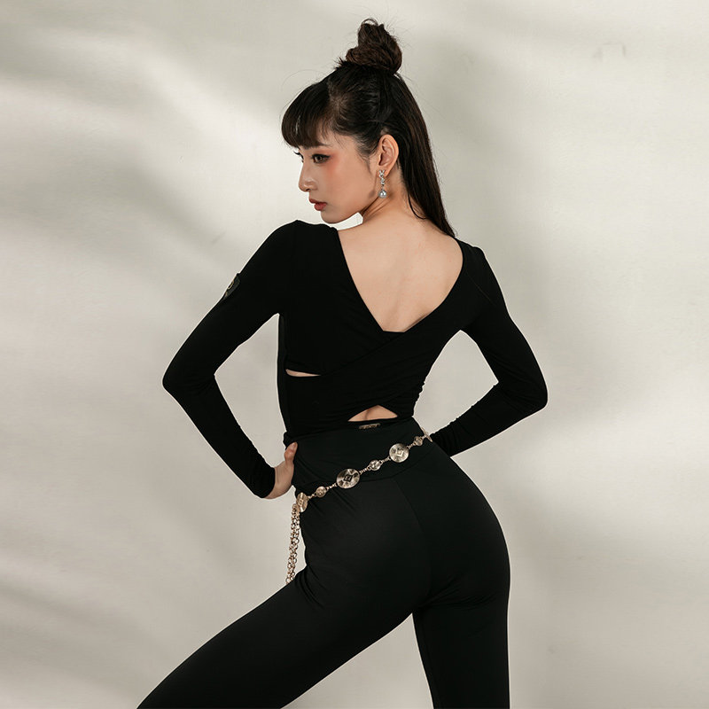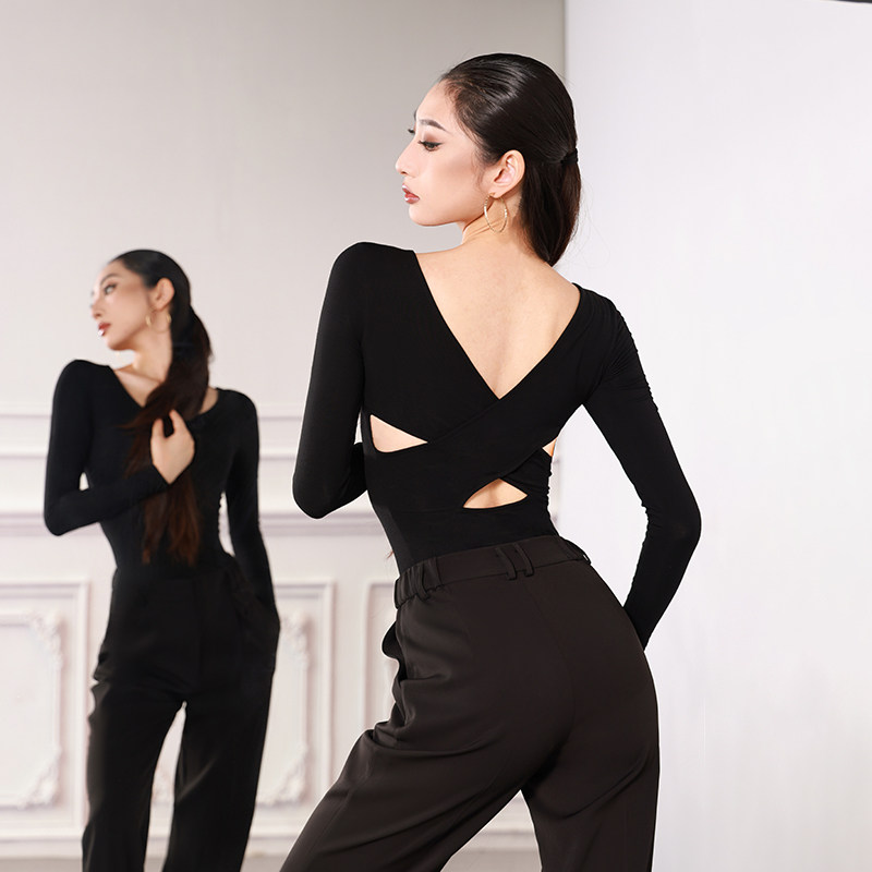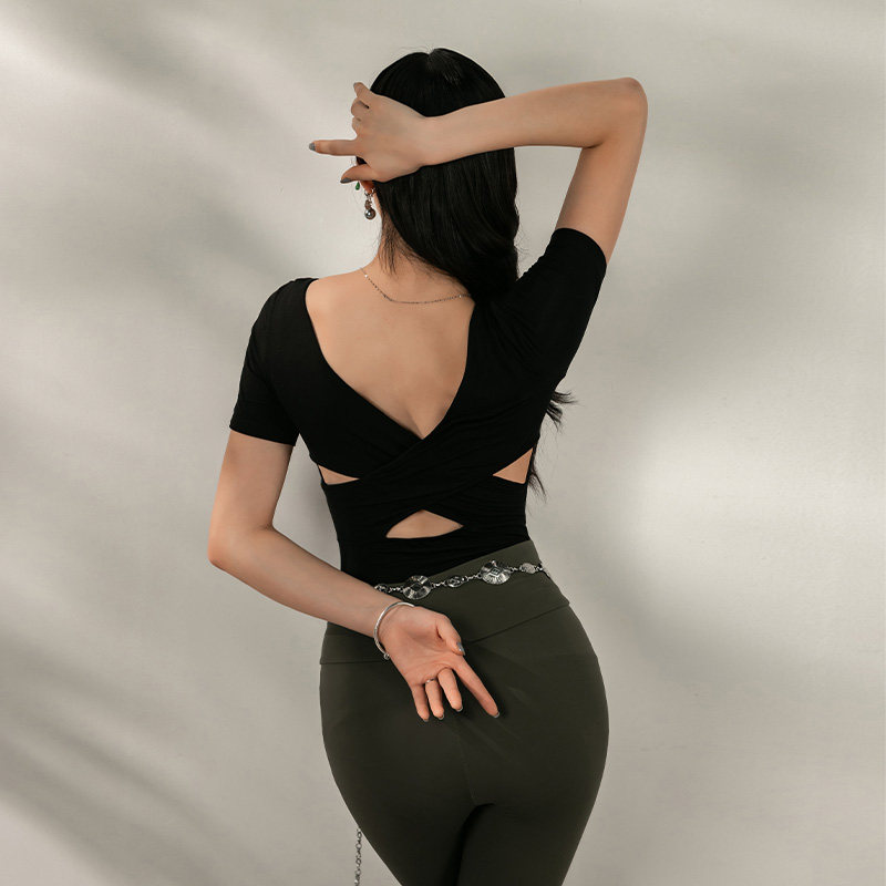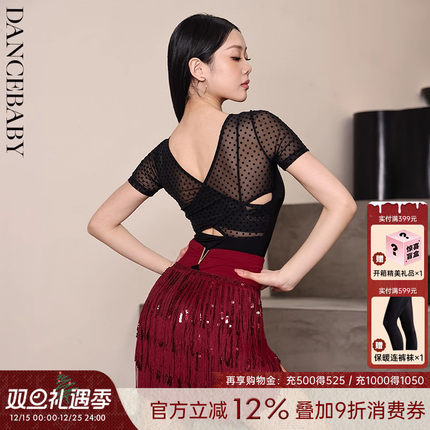DANCEBABY国标舞拉丁舞上衣交谊舞新款女练功服漏背短袖上衣YS49