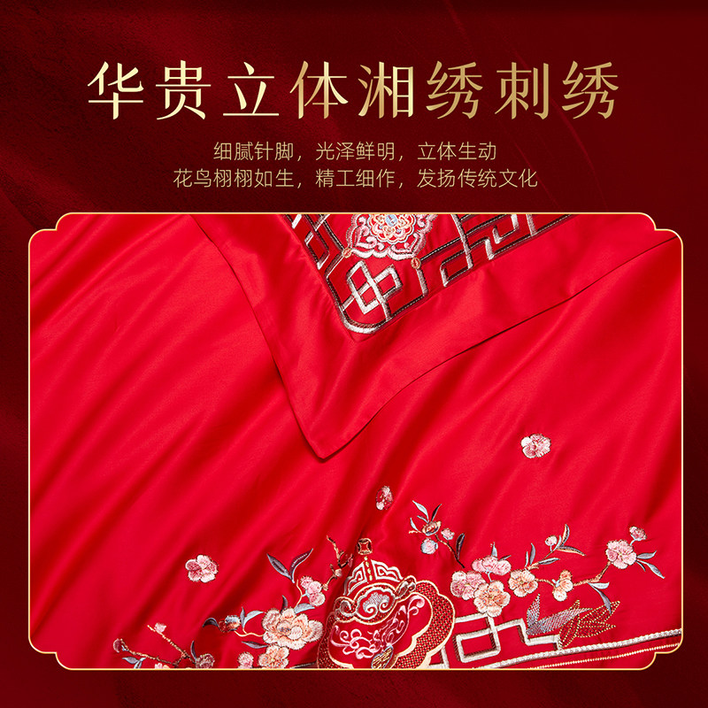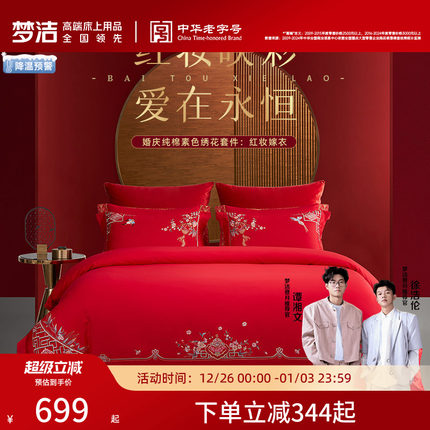 梦洁60支全棉纯棉长绒棉四件套大红色婚庆结婚床上用品刺绣喜被