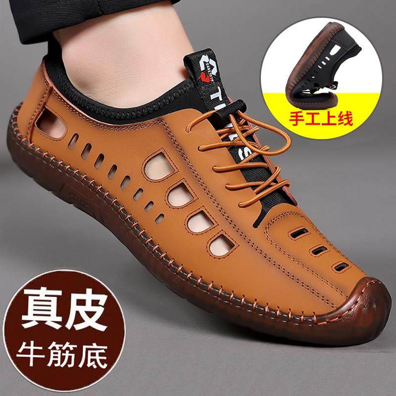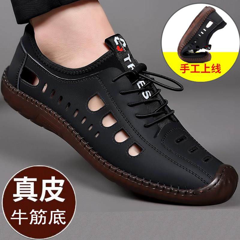 洞洞皮凉鞋男真皮2024牛筋软底中年爸爸鞋夏季休闲镂空沙滩凉皮鞋