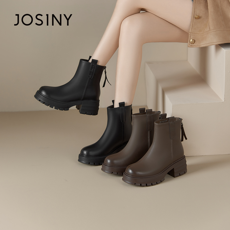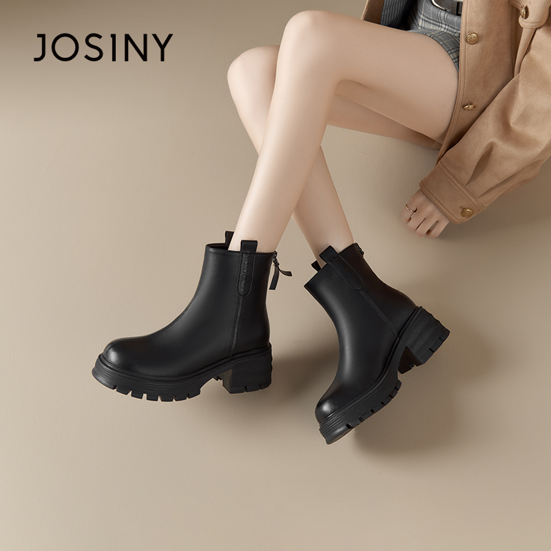 卓诗尼女鞋撤柜正品女靴冬季加绒保暖马丁靴中粗跟厚底烟筒靴短靴