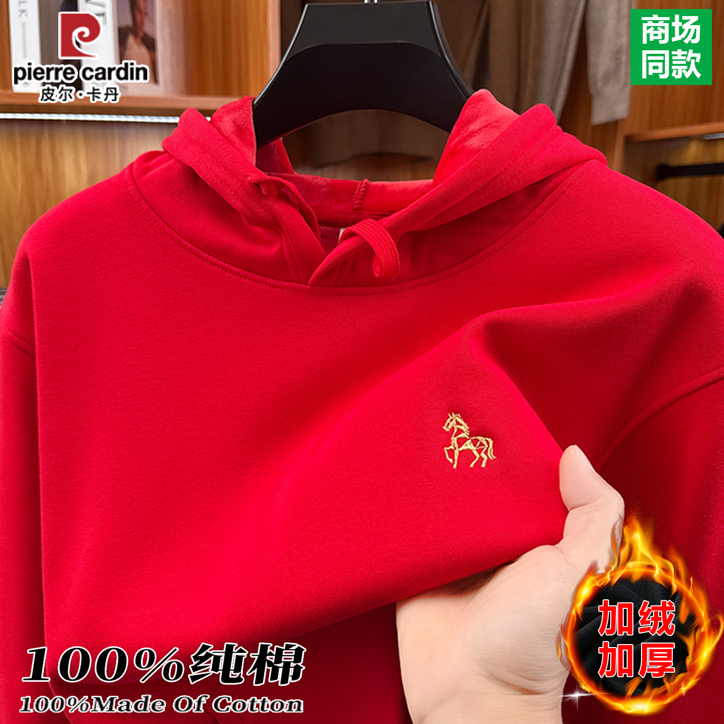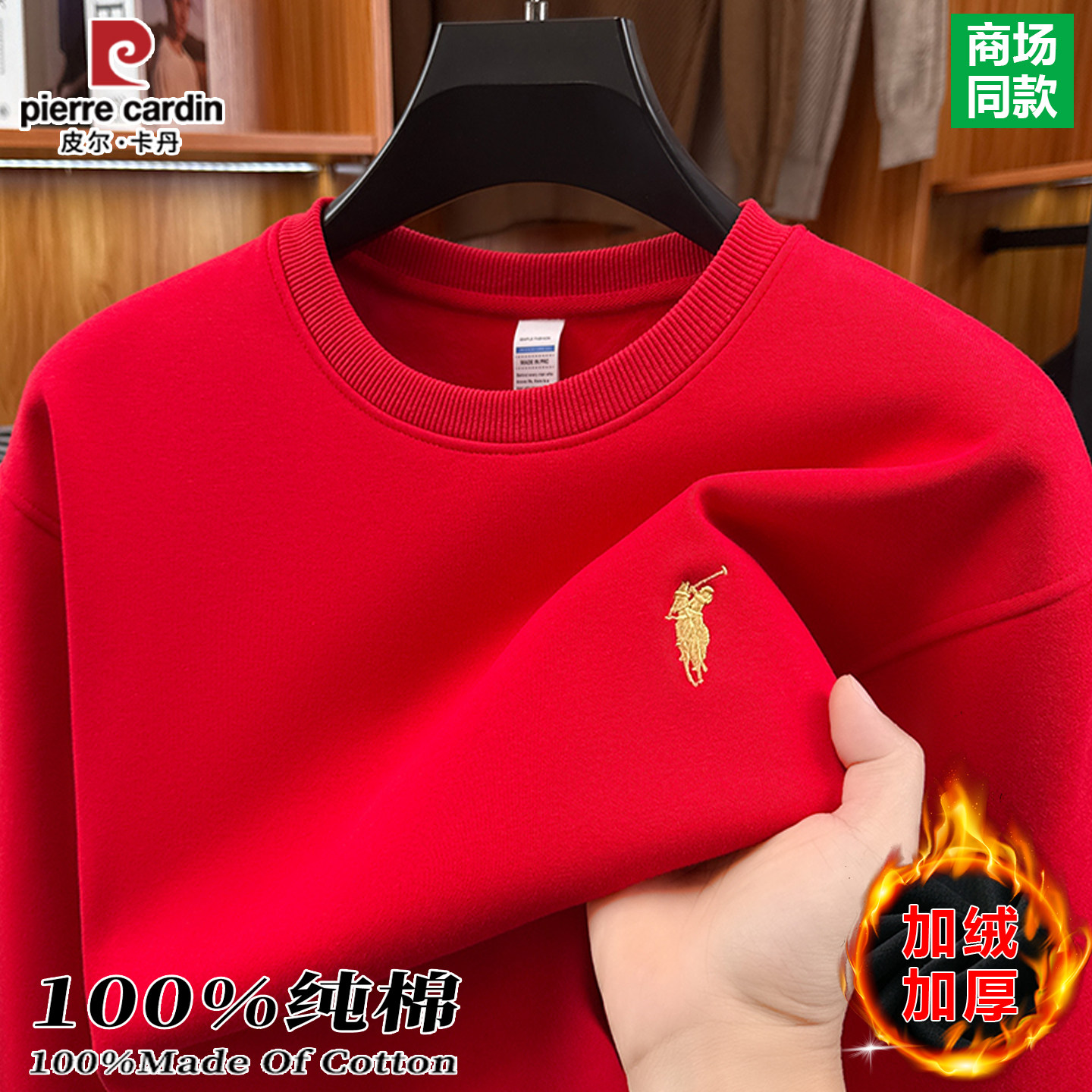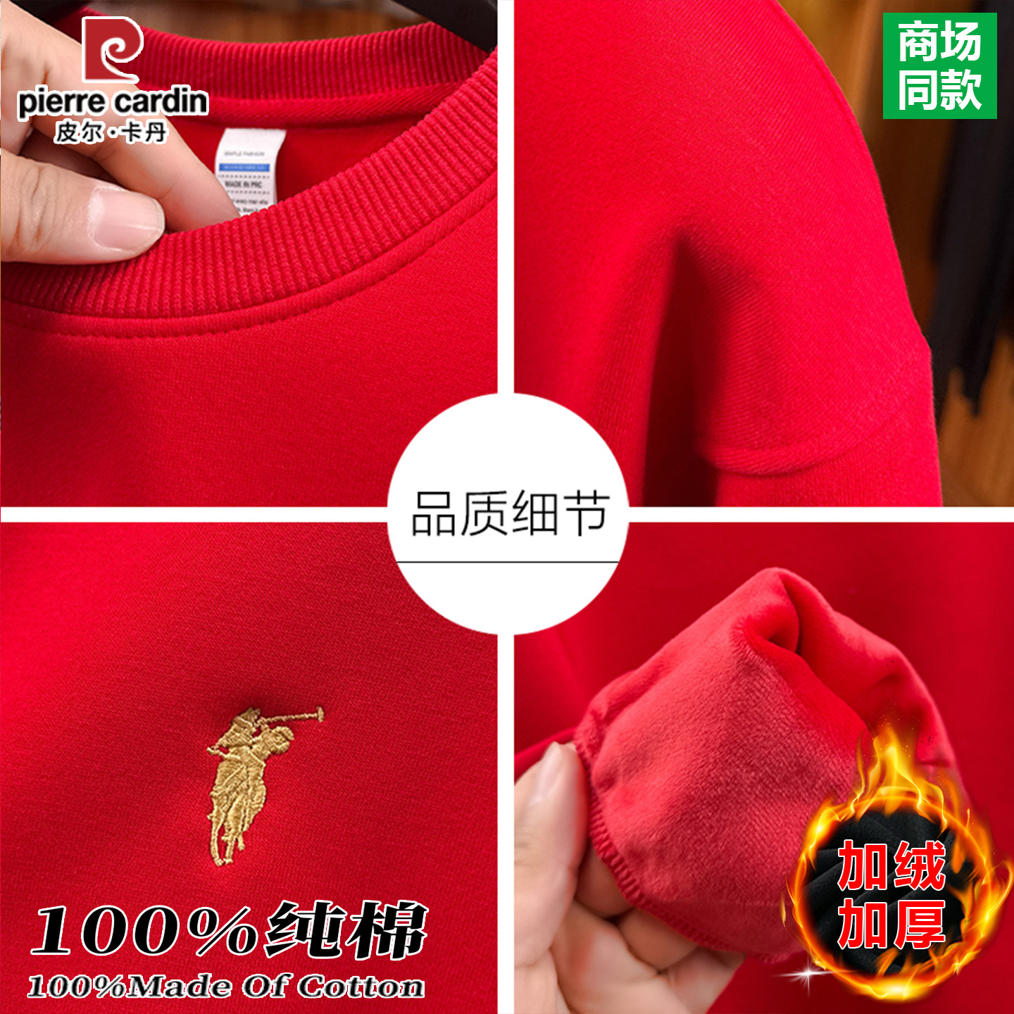 皮尔卡丹100%棉男士本命年加绒保暖红色卫衣冬季长袖T恤新年上衣