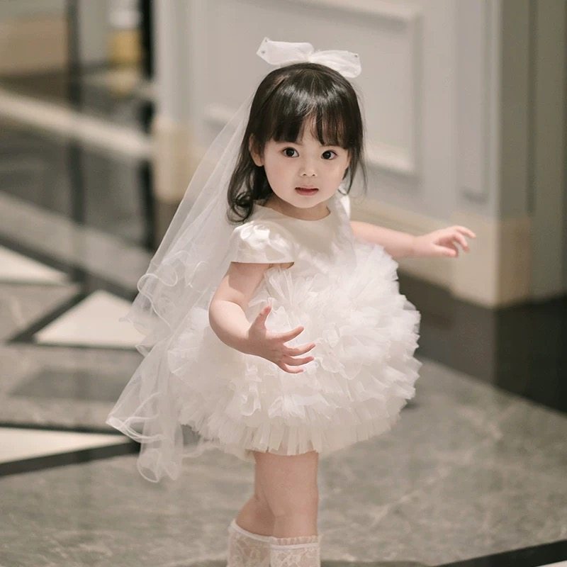 白色女童周岁生日抓周服小花童婚纱礼服女公主裙冬款礼服蓬蓬裙绒