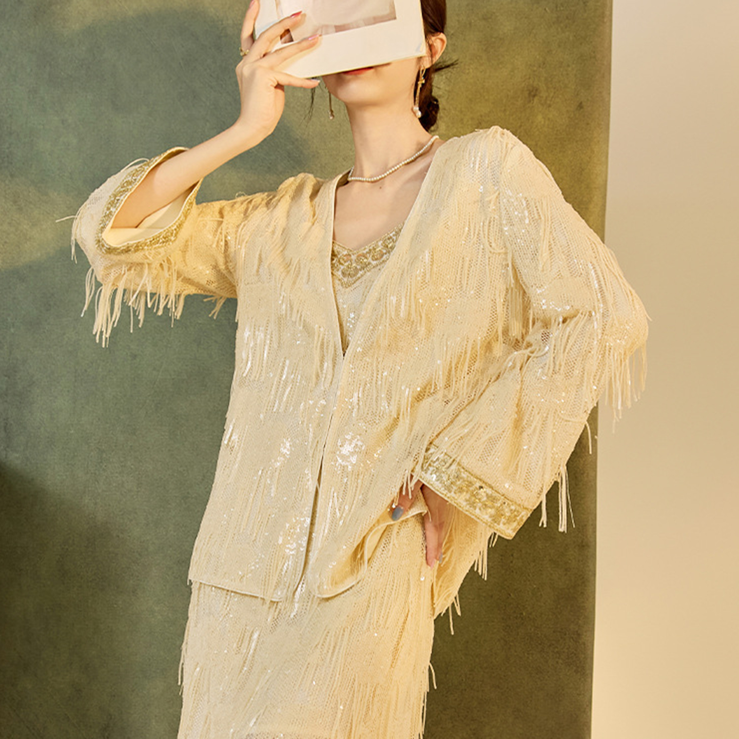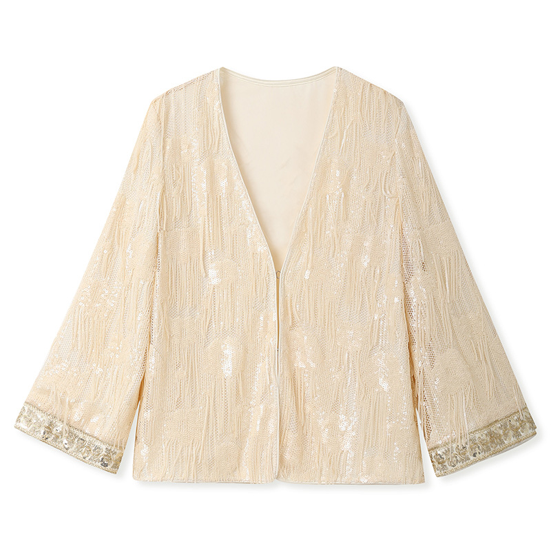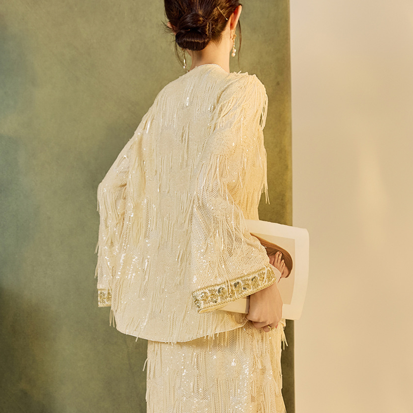 AYOMIS原创设计新中式高端亮片流苏刺绣v领秋季国风气质开衫外套