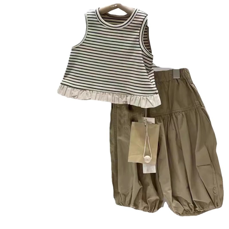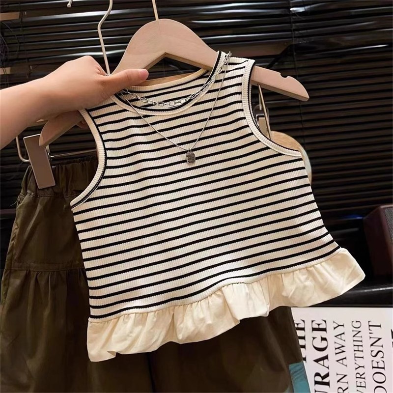 女童背心工装裤套装夏装新款儿童洋气条纹花边宝宝无袖上衣两件套