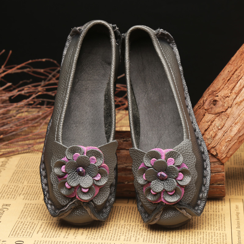 2025原创真皮包头单鞋休闲女鞋平底舒适民族风花朵手工女鞋四季鞋
