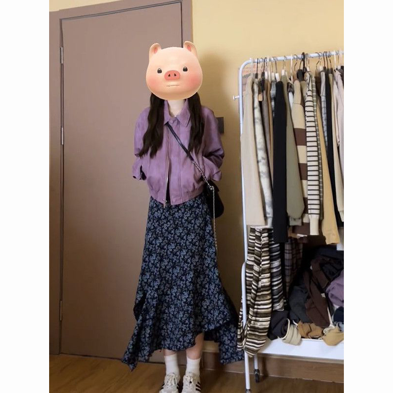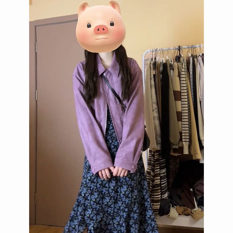 秋季温柔小个子气质感紫色短款夹克外套+不规则碎花连衣裙两件套