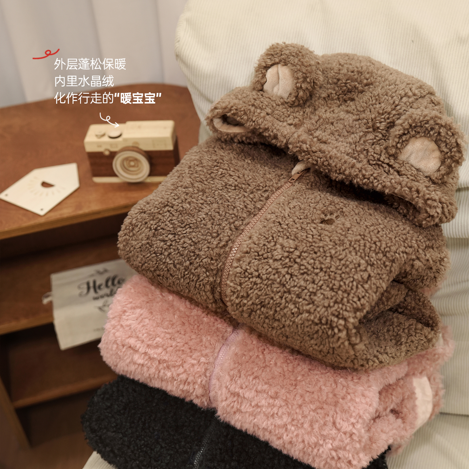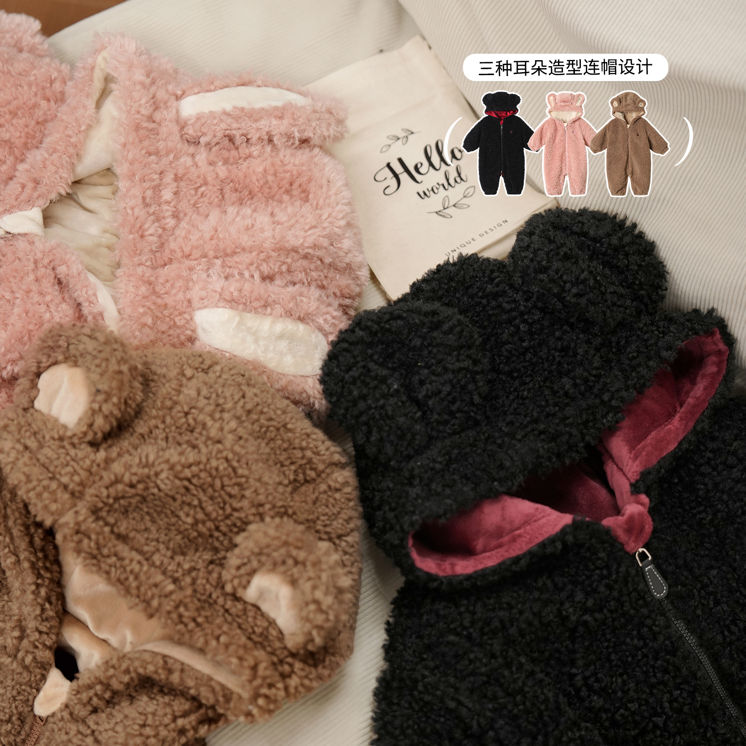 小O爸男婴童 宝宝秋冬哈衣连帽保暖爬服毛绒绒可爱加厚婴儿连体衣