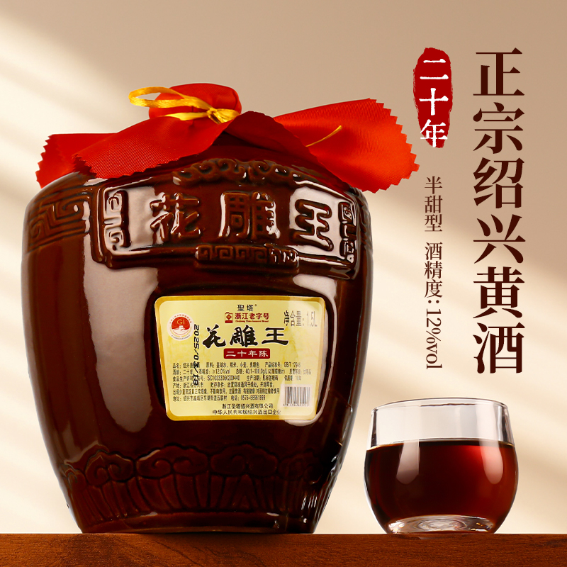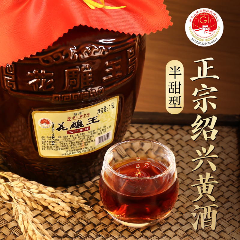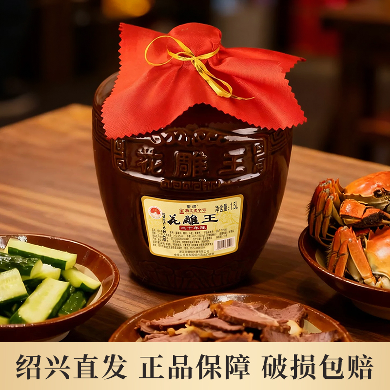 正宗绍兴老黄酒圣塔二十年陈花雕王1.5L坛装半甜型糯米善酿加饭酒