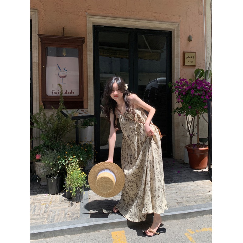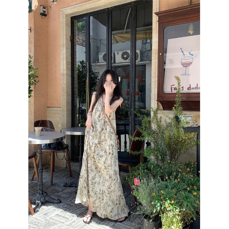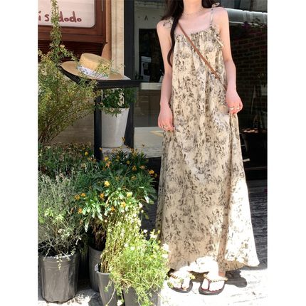 海边度假温柔风气质吊带连衣裙女夏宽松显瘦小众设计水墨碎花长裙