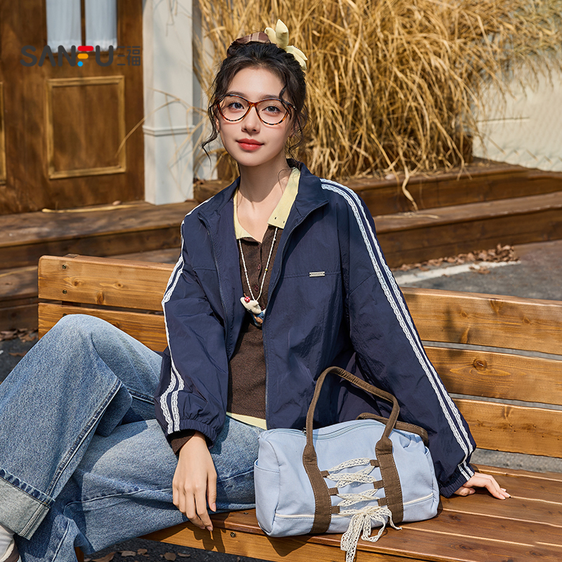 三福外套女2025新款秋季韩系杠条蕾丝宽松翻领蓝色上衣女装507601