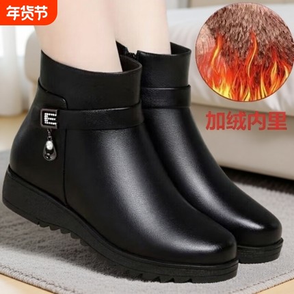 真皮妈妈棉鞋短靴女冬季新款平底加绒保暖防滑中老年女靴中跟内里