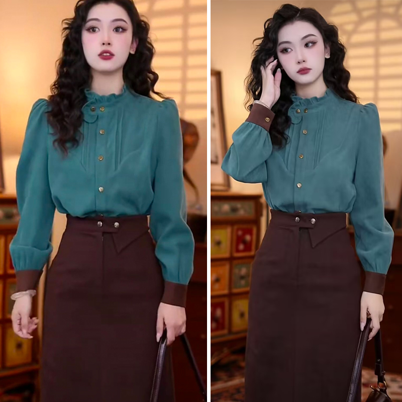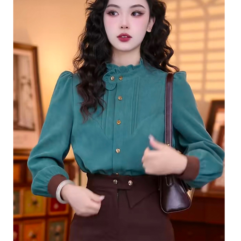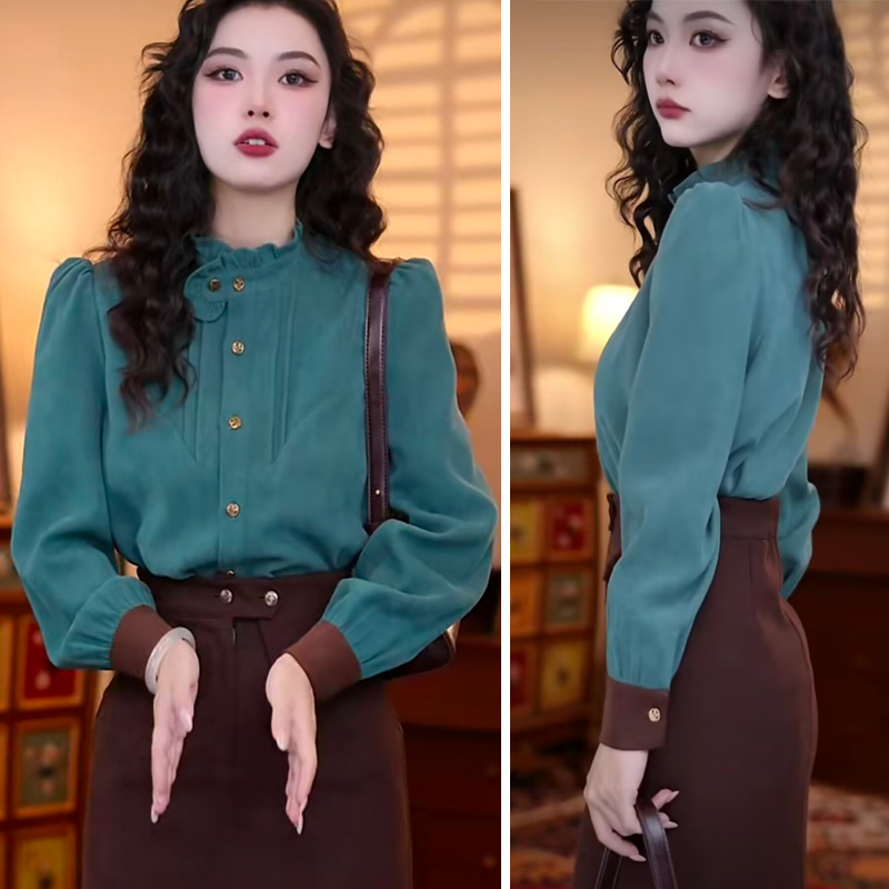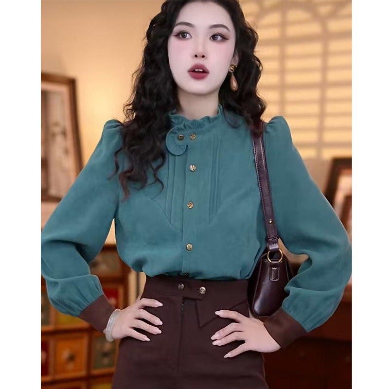 设计感木耳边长袖衬衫女打底秋冬款港风复古宽松上衣法式别致小衫