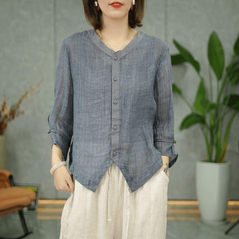 撞色复古棉麻衬衫女长袖衬衣夏季