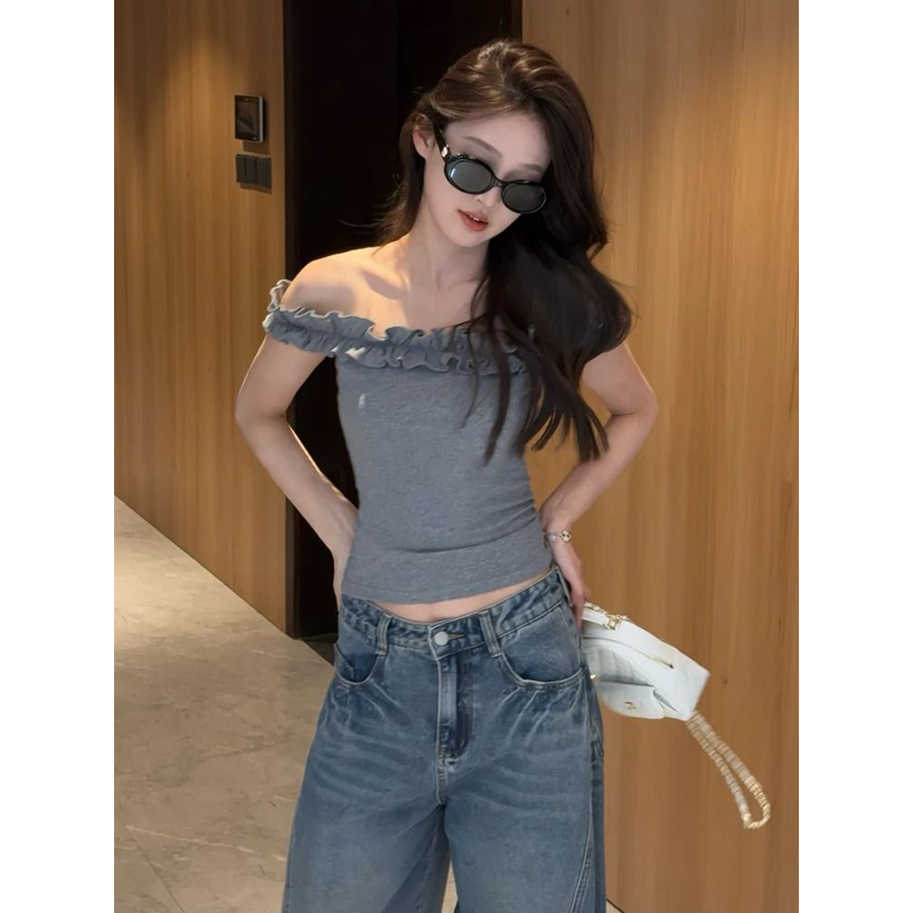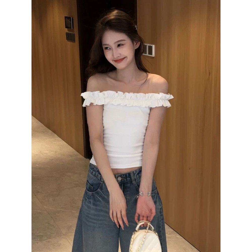 白色纯欲风一字肩木耳边白色T恤女夏季修身显瘦别致短款露脐上衣