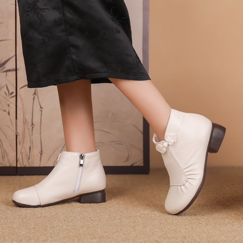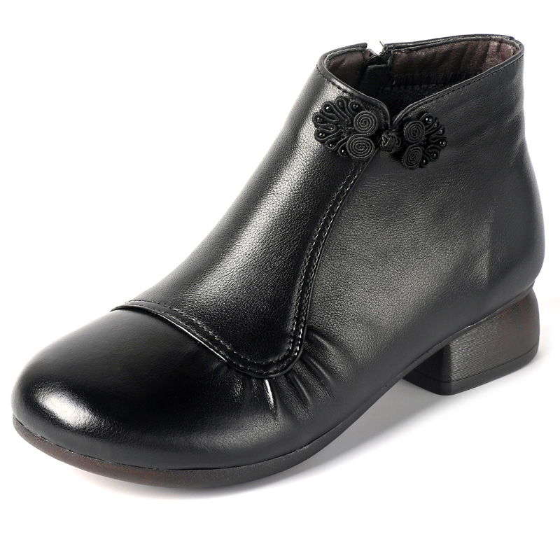 真皮软底妈妈鞋秋冬复古低跟短靴粗跟大码女靴保暖中老年加绒棉靴