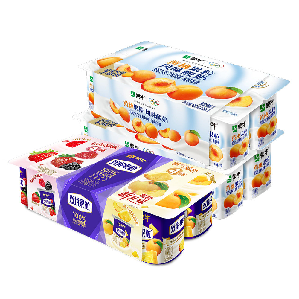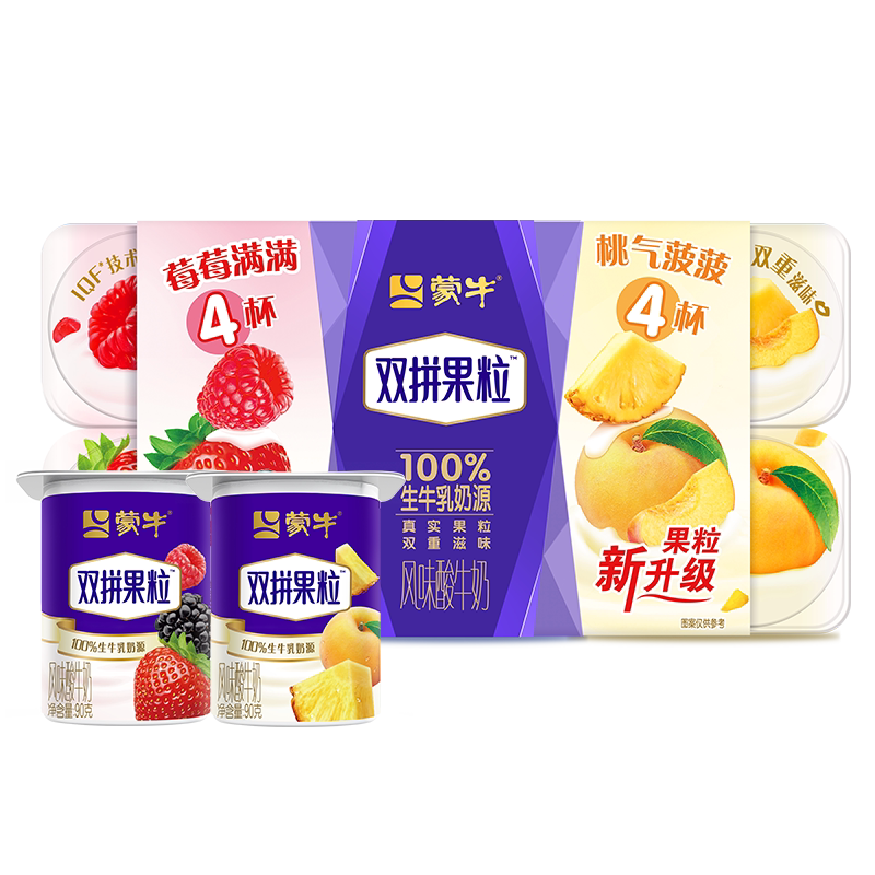 蒙牛双拼0蔗糖西柚蓝莓风味酸奶8杯+鲜果粒黄桃风味圆周杯16杯