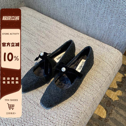 【TFM】高级感法式气质平底加绒单鞋女2025冬季毛呢方头通勒棉鞋
