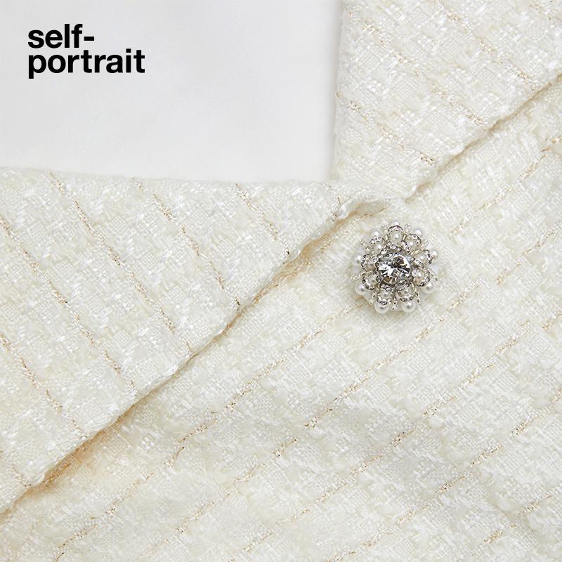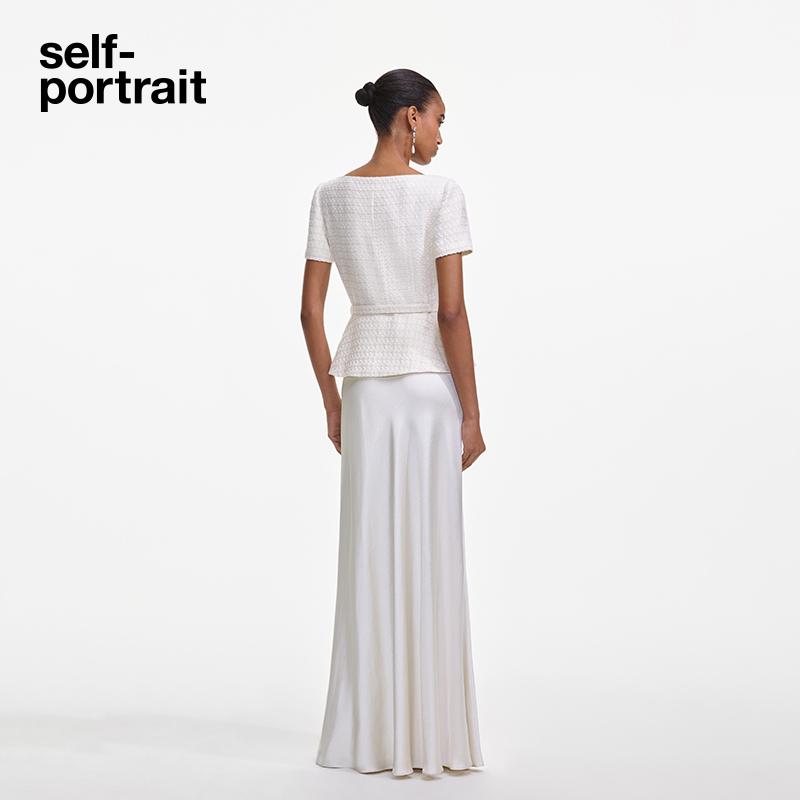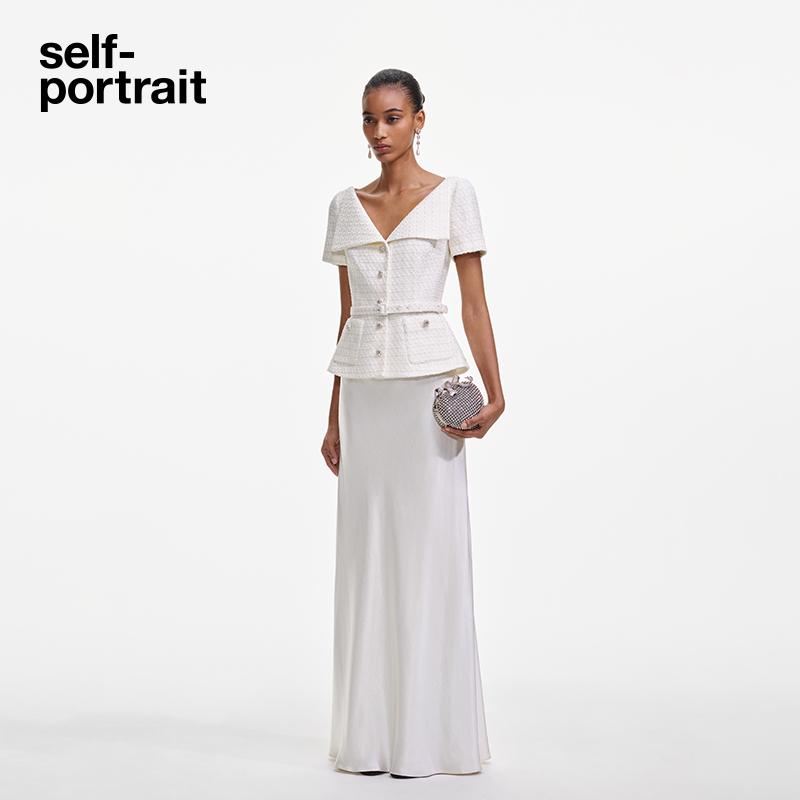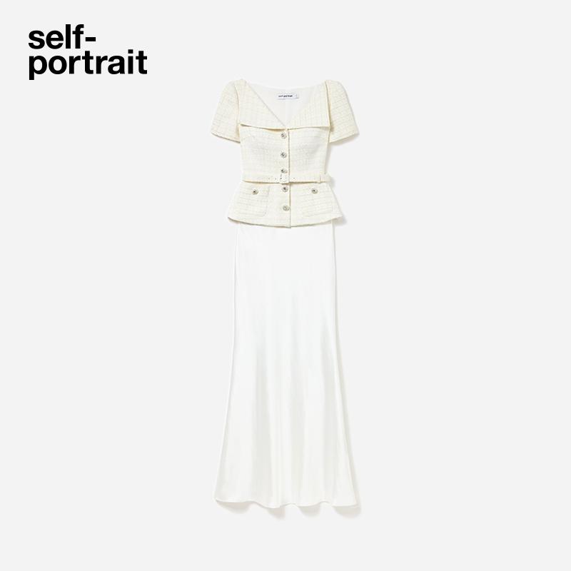 self-portrait 2025春夏象牙白小香风假两件缎面礼服连衣裙