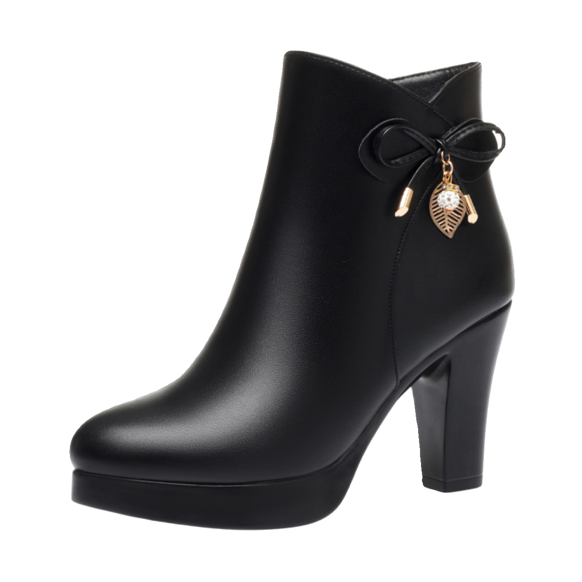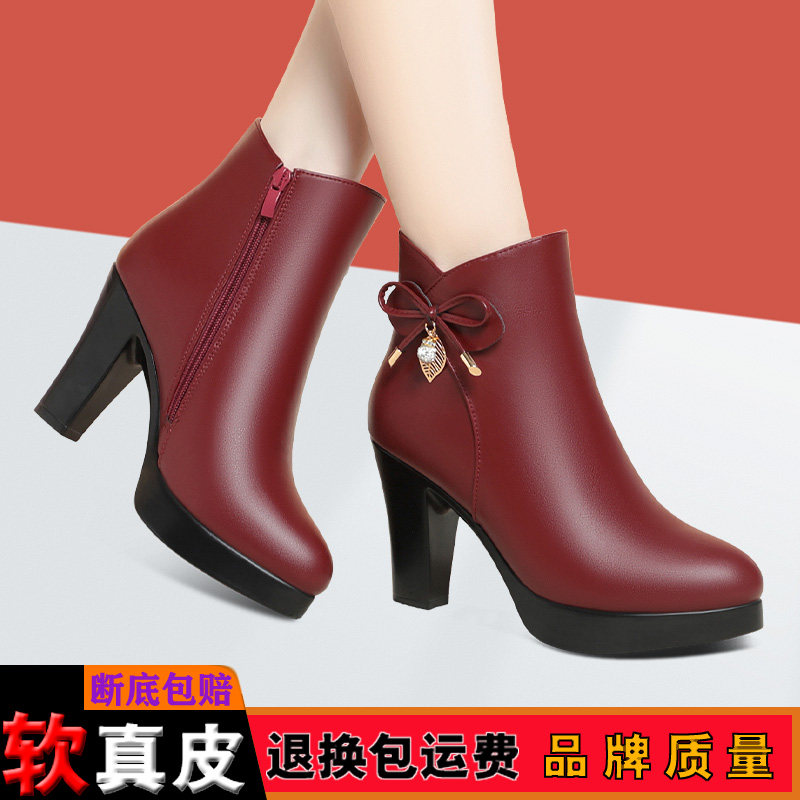 2023年秋冬新款真皮高跟女士皮靴防水台中跟妈妈短筒女靴粗跟短靴
